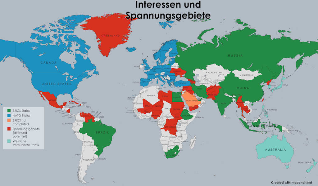 Alle Bündnisse, Organisationen, Formate und deren Mitgliedsländer haben Interessen, die über die jeweils eigenen Grenzen hinaus gehen und oft miteinander konkurrieren. Dies ist leider nicht immer friedlich möglich und wo nicht, muss es den Menschen allerorts auch irgendwie so verkauft werden, dass diese dem zustimmen, was ihre Regierungen tun. Allsu oft können die Regierungen hierbei nicht unbedingt mit der reinen und offenen Wahrheit arbeiten, sondern finden vielfach Ausflüchte, vorgeschobene Gründe oder sogar Alternativlosigkeit, weil alles massiv Geld und oft viele Leben kostet und unerwünschte Folgen haben kann, die man dann auch gern anderen Akteuren zuschiebt. So entstehen die aktuellen Erklärungen der derzeitigen Geopolitik, die man in jedem Fall hinterfragen sollte. Sehr oft verhält es sich mit den tatsächlichen Gegebenheiten völlig anders, als offiziell verkauft wird. Sehr wichtig zu wissen ist, dass es bei den Umsetzungen der Interessen der Politik niemals darum geht, Menschen, Gruppen oder Völkern selbstlos zu helfen und auch niemals um Frieden, Freiheit und Menschenrechte. Es geht immer um knallharte Interessen, in denen vor allem Macht, Kontrolle und über allem wirtschaftliche Vorteile und Profit stehen.