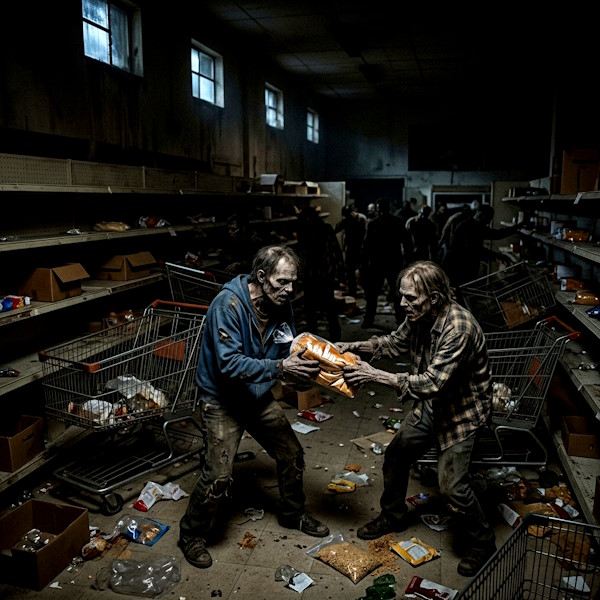 Supermärkte schliessen oder bleiben zwar geöffnet, doch Kartenzahlung funktioniert nicht mehr. Kühlketten brechen zusammen. Innerhalb weniger Stunden beginnen Menschen, alles zu kaufen, was sie tragen können. Regale leeren sich schneller, als sie je gefüllt werden könnten. Moderne Supermärkte haben auch keine Lager mehr, müssen laufend beliefert werden. Die Lieferungen bleiben nun allerdings aus.